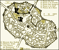 Une fois à l'abri des murs, les rues de Natis sont cependant aussi animées et bruyantes que celles de n'importe quelle cité. La Passe des Soupirs conduit au souk, cœur de Dershin, le quartier le plus commerçant : on fait de bonnes affaires sous ses arcades tranquilles, où des vendeurs ambulants aux vastes turbans garnis de tasses, une lourde théière dans le dos, proposent de boire le thé grillé, à la mode du pays. La partie du souk se trouvant au pied du Palais est soumise à des lois curieuses : pour protéger le repos de ses ancêtres conquérants, l'émir a décrété que les vils marchands devaient se livrer à leurs trafics dans le silence... Ces lois sont à peu près respectés : par ici, tout le commerce est fait de gestes feutrés et de murmures, dans l'ombre des statues de héros aux visages effrités. Le quartier de Tournegouche est aussi industrieux, mais plus besogneux; la rue des Grands Muscs qui le traverse a des odeurs de bétail, venues de la campagne qui prospère autour de Karys. C'est aussi de là que viennent les convois d'eau fraîche, puisée aux belles sources de Modsab : la plupart des fontaines de Natis ne sont plus que des sculptures sèches.