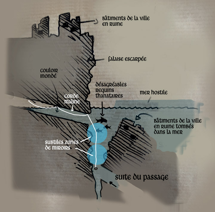 Le couloir continue et aboutit dans une grande salle au sommet de laquelle se trouve une poche d'air dans laquelle il reprend son souffle, soulagé. Puis il trouve une sortie au fond de celle-ci, donnant dans un couloir qui, au bout de quelques mètres, forme un léger coude remontant en pente douce en direction de la surface. Il décide alors de faire sa dernière zone d'eau en air à cet endroit-là, afin d'assécher tout le complexe. Cela fonctionne parfaitement et il se retrouve au sec. En remontant le couloir ruisselant il arrive dans une salle qu'il connaît, ou plutôt qu'il a vue par magie lorsqu'il observait Blamort de Camberet depuis l'île de la sorcière.