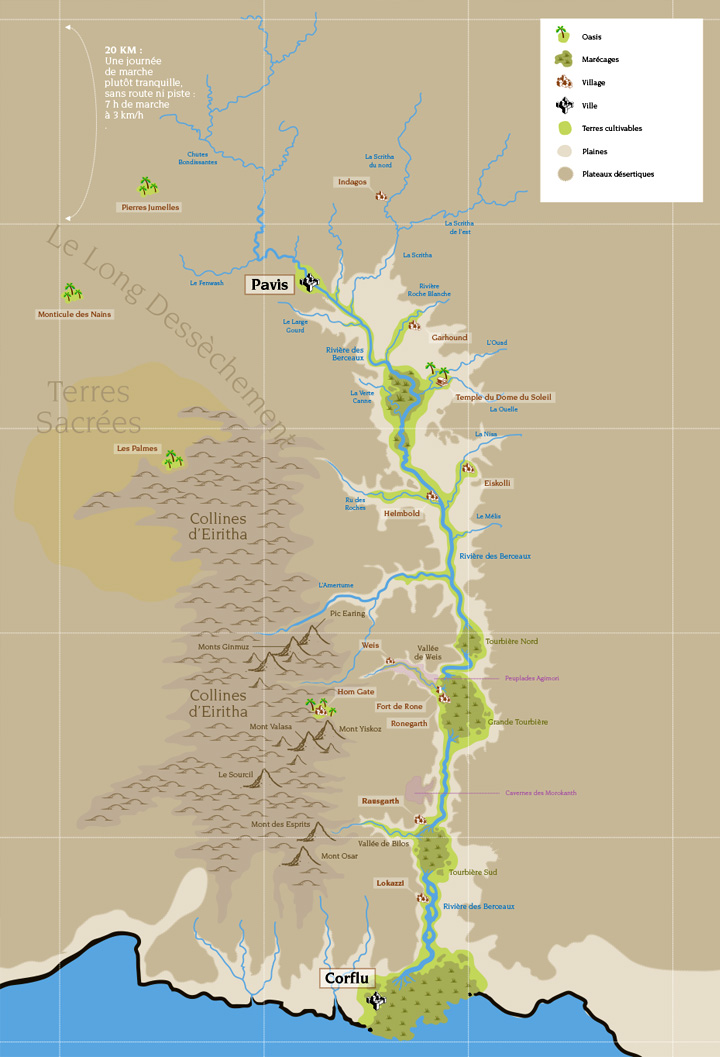 Ceci est une carte qu'aucun personnage ne possède (pour l'instant), mais qu'il est utile de présenter pour situer l'action. Le village de départ est celui de Rausgarth, dans le canyon de la Rivière des Berceaux.