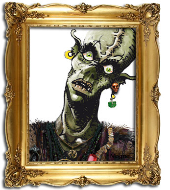 Immense et maigre, le dos voûté et la main tenant le haut d´un bâton noueux, le jeune Borakaï Tête Brisée paraît au moins le doublen regard ne cille jamais, comme deux lunes blanches dans une face noire. Le sourcil noir et le visage taillé à la serpe, il étonne par son crâne rasé et la cicatrice verticale qui le lui fend en deux, de son sommet au milieu du nez. Il est vêtu d´un amas de peaux de bêtes, oripeaux rituels de l´initié des Dieux. Des tas de colifichets, fétiches et autres talismans lui pendent de partout. Il les caresse souvent en murmurant des prières secrètes. Sa démarche est gauche, et dénote l´orque qui n´a pas consacré sa vie aux champs de bataille. Mais ce qui surprend le plus ce sont les apparitions qui jalonnent ses pas : de temps en temps un corbeau sur son épaule, apparu sans voler, un un crâne dans sa main auquel il parle avec mépris. Ses mains qui changent de couleur lorsqu´il les lève au ciel, ou le bruit du vent autour de lui. A ses pieds un gros sac ventru et rapiécé exhale une forte odeur végétale.